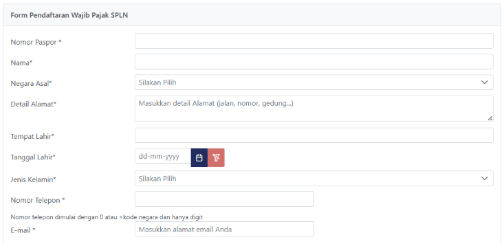 Selanjutnya isi informasi pada formulir pendaftaran wajib pajak SPLN dan lengkapi dokumen pendukung lainnya seperti, Foto wajib pajak dan Foto paspor seperti gambar dibawah ini.